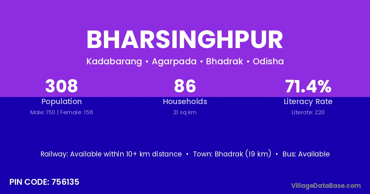 Bhadrak (19 km) is the nearest town to Bharsinghpur village for major economic activities and is located approximately 19 km away.
