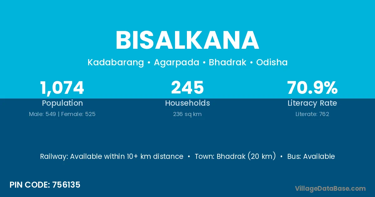 Bhadrak (20 km) is the nearest town to Bisalkana village for major economic activities and is located approximately 20 km away.