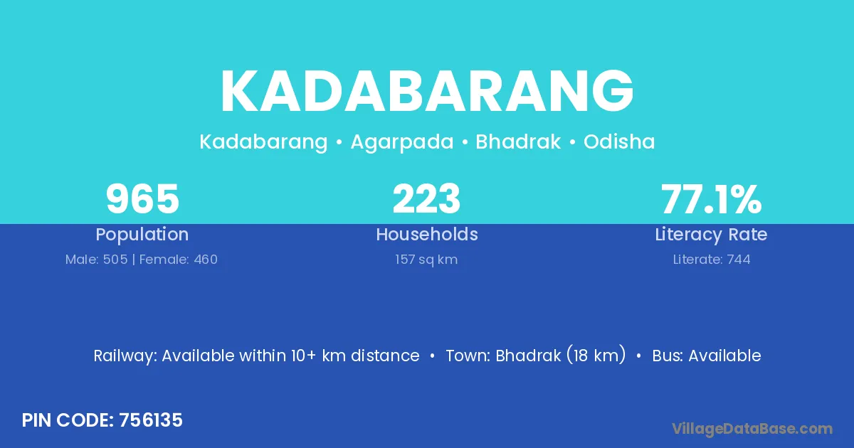Bhadrak (18 km) is the nearest town to Kadabarang village for major economic activities and is located approximately 18 km away.