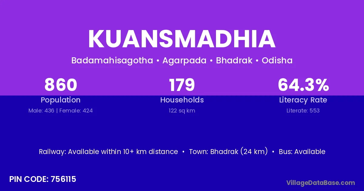 Bhadrak (24 km) is the nearest town to Kuansmadhia village for major economic activities and is located approximately 24 km away.