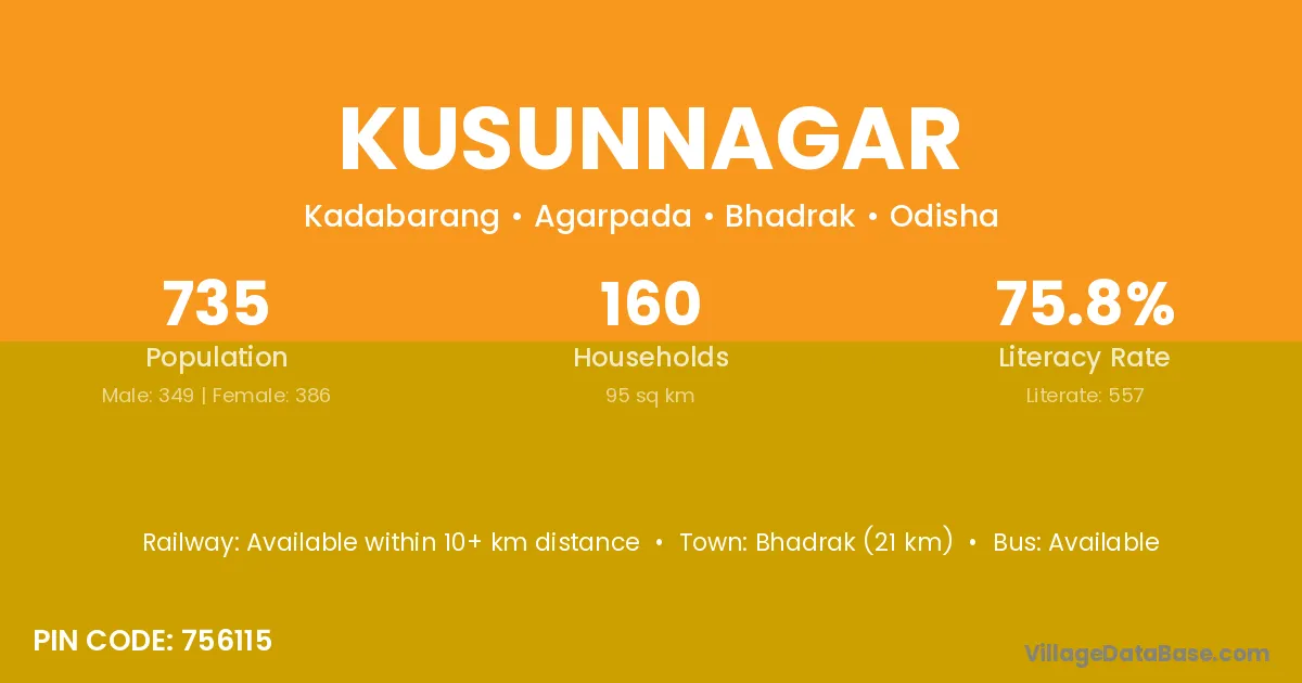 Bhadrak (21 km) is the nearest town to Kusunnagar village for major economic activities and is located approximately 21 km away.