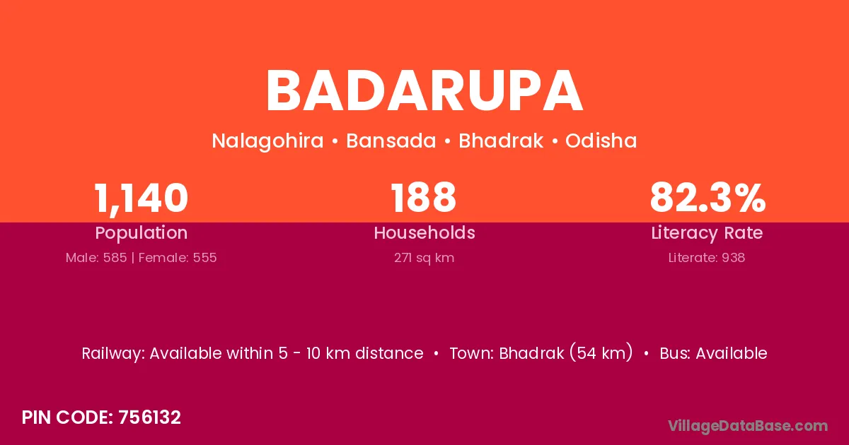 Bhadrak (54 km) is the nearest town to Badarupa village for major economic activities and is located approximately 54 km away.