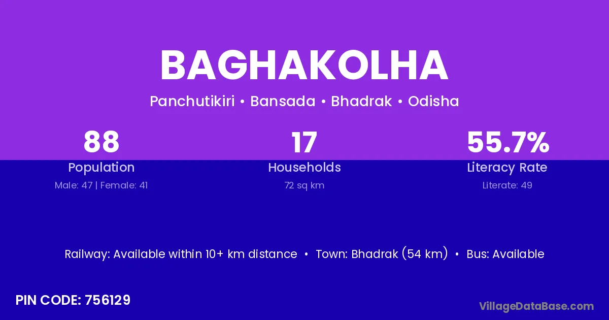 Bhadrak (54 km) is the nearest town to Baghakolha village for major economic activities and is located approximately 54 km away.