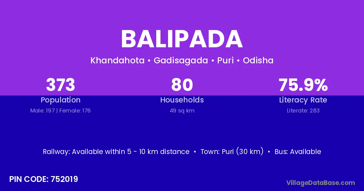 Bhadrak (32 km) is the nearest town to Balipada village for major economic activities and is located approximately 32 km away.