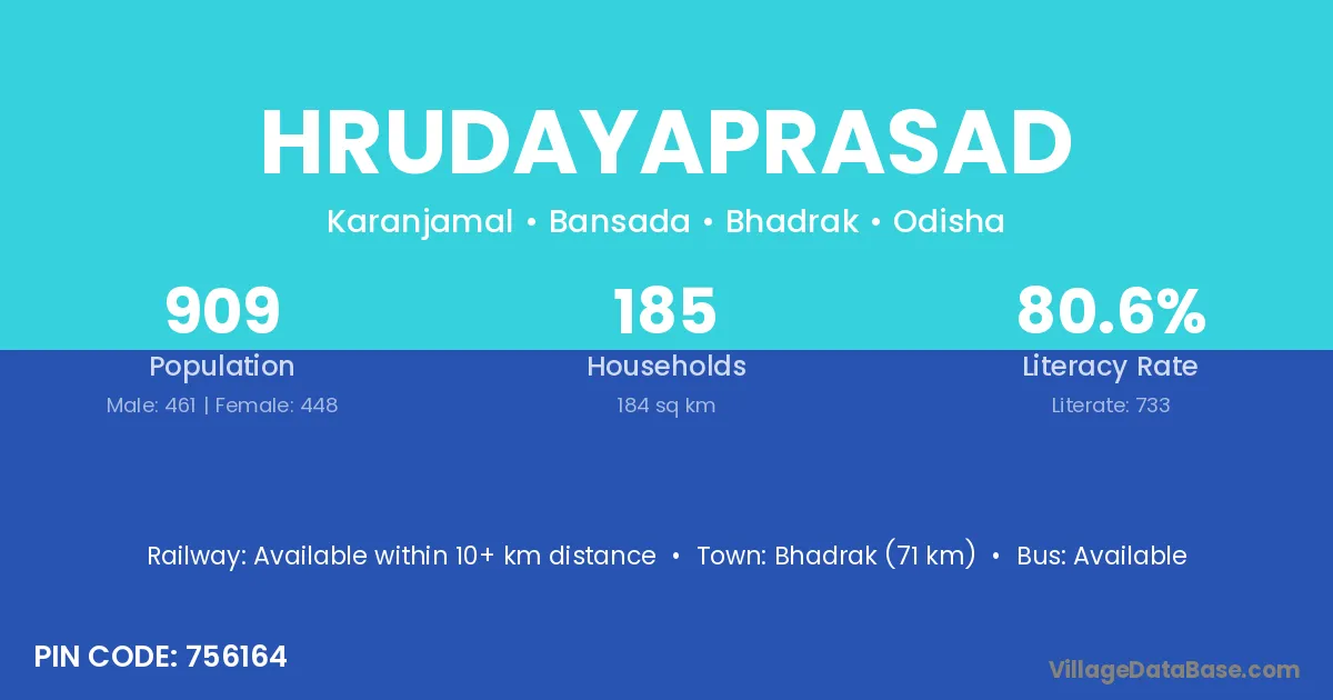 Bhadrak (71 km) is the nearest town to Hrudayaprasad village for major economic activities and is located approximately 71 km away.