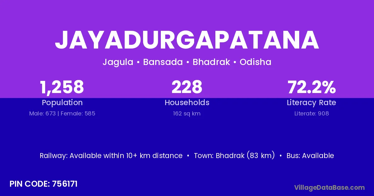 Jayadurgapatana village has a total population of 1,258 people, of which 673 are males and 585 are females.