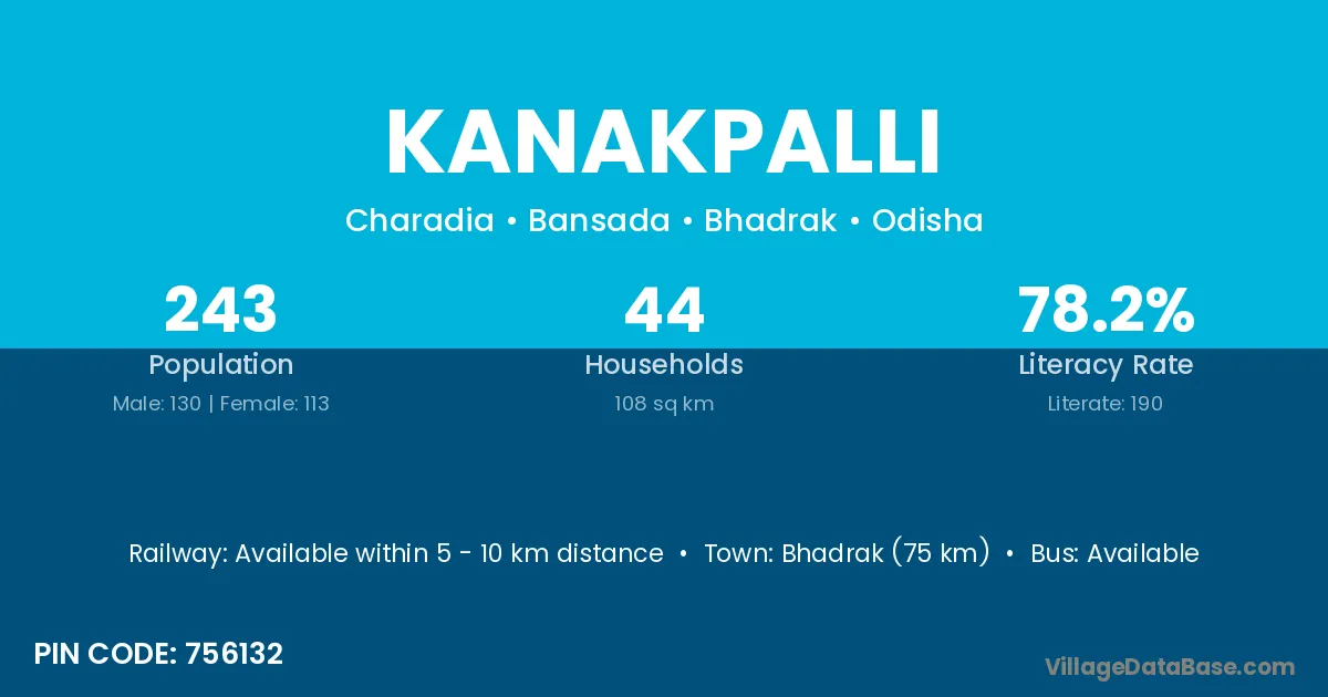 Bhadrak (75 km) is the nearest town to Kanakpalli village for major economic activities and is located approximately 75 km away.