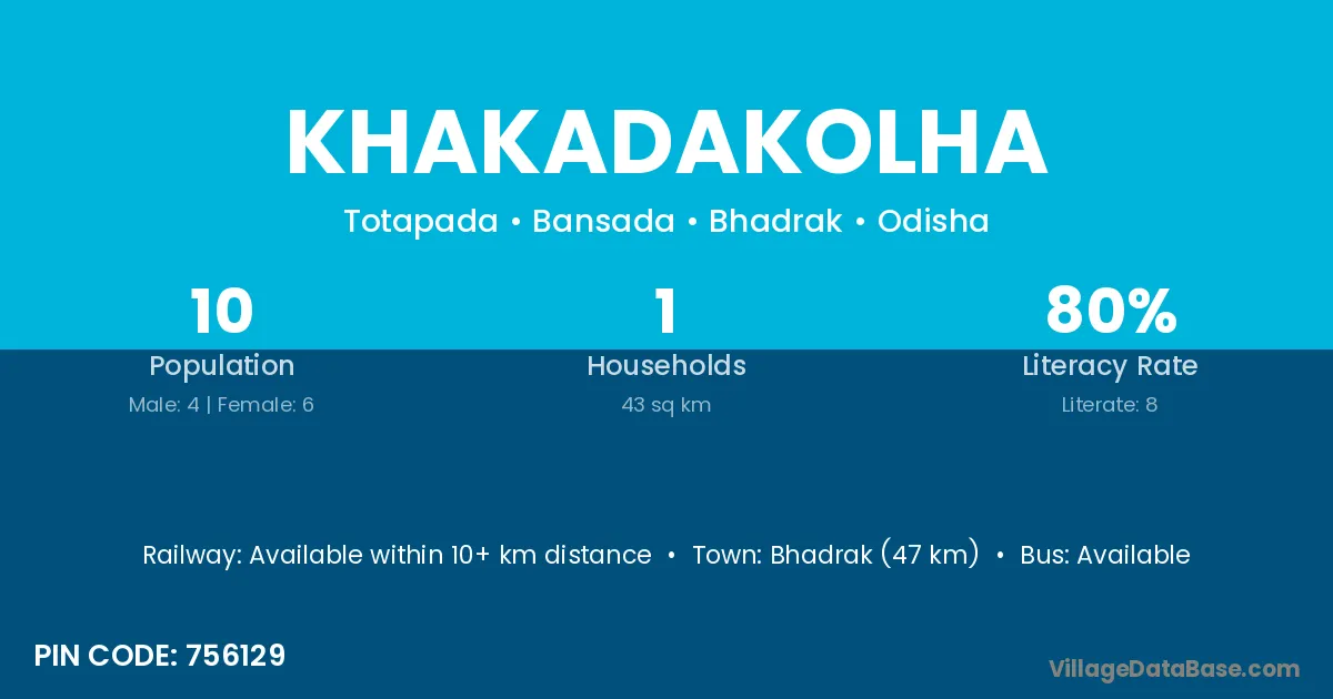 Bhadrak (47 km) is the nearest town to Khakadakolha village for major economic activities and is located approximately 47 km away.