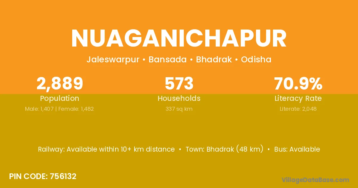 Bhadrak (48 km) is the nearest town to Nuaganichapur village for major economic activities and is located approximately 48 km away.