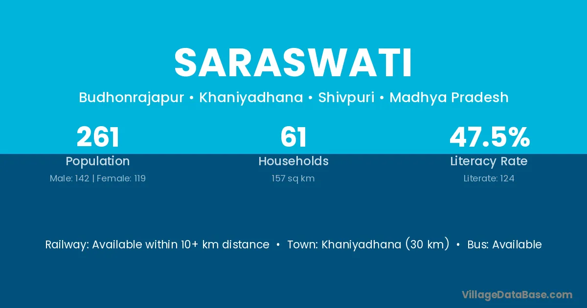 The literacy rate of Saraswati village is 70.19%. Male literacy stands at 78.57% and female literacy at 62.02%.