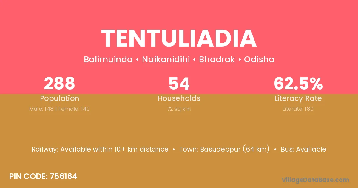 Bhadrak (57 km) is the nearest town to Tentuliadia village for major economic activities and is located approximately 57 km away.