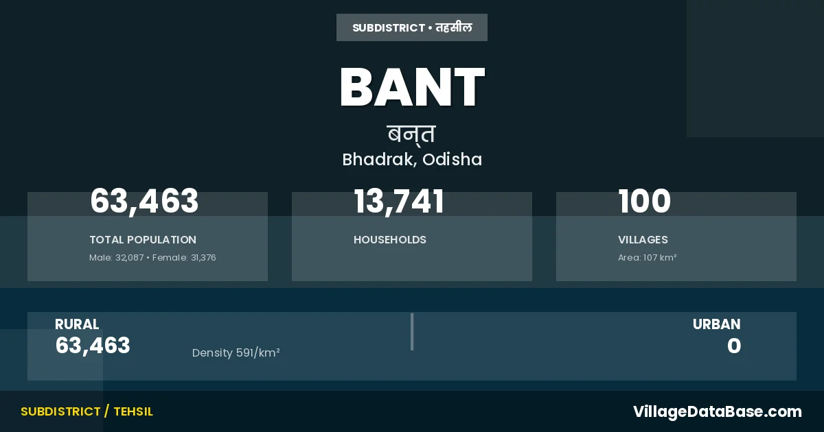 Bant is a town and Tehsil in the Bhadrak district of the Odisha. In India, a Tehsil is a subdivision of a district responsible for the administration and revenue collection of a specific area within the district. Tehsils play a crucial role in the local governance structure, contributing significantly to the development and administration of their communities.