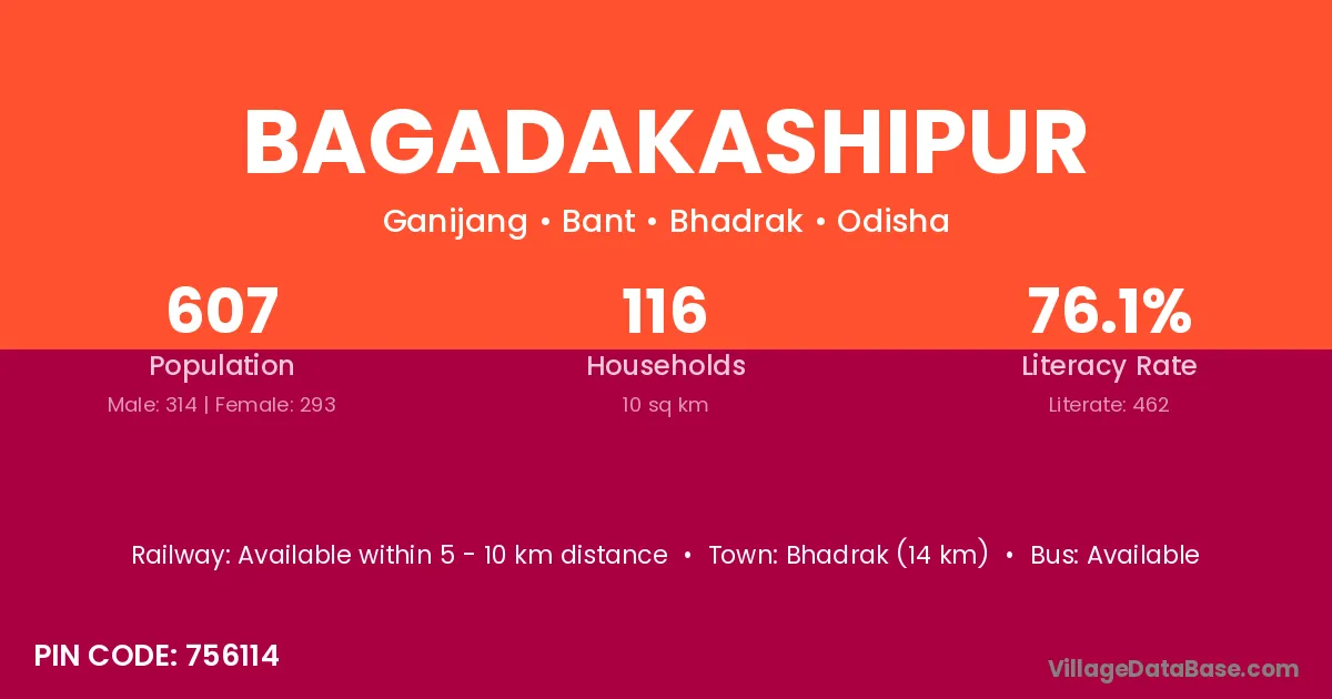 Bhadrak (14 km) is the nearest town to Bagadakashipur village for major economic activities and is located approximately 14 km away.