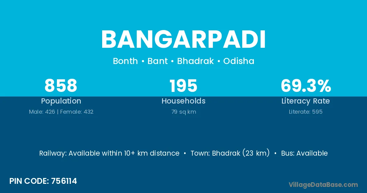 Bhadrak (23 km) is the nearest town to Bangarpadi village for major economic activities and is located approximately 23 km away.