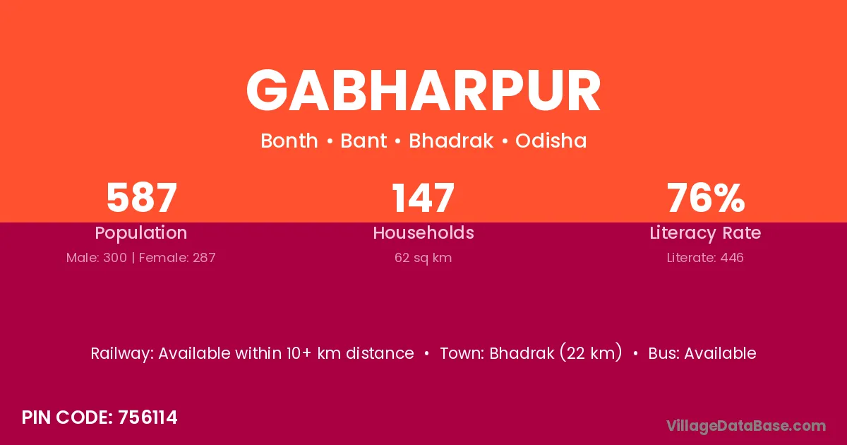 Bhadrak (22 km) is the nearest town to Gabharpur village for major economic activities and is located approximately 22 km away.
