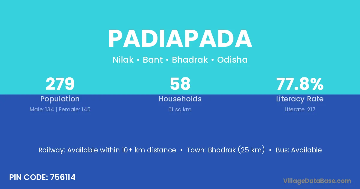 Bhadrak (25 km) is the nearest town to Padiapada village for major economic activities and is located approximately 25 km away.
