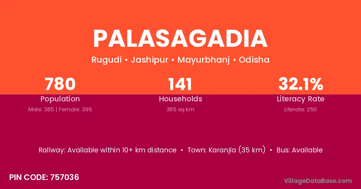 Bhadrak (30 km) is the nearest town to Palasagadia village for major economic activities and is located approximately 30 km away.