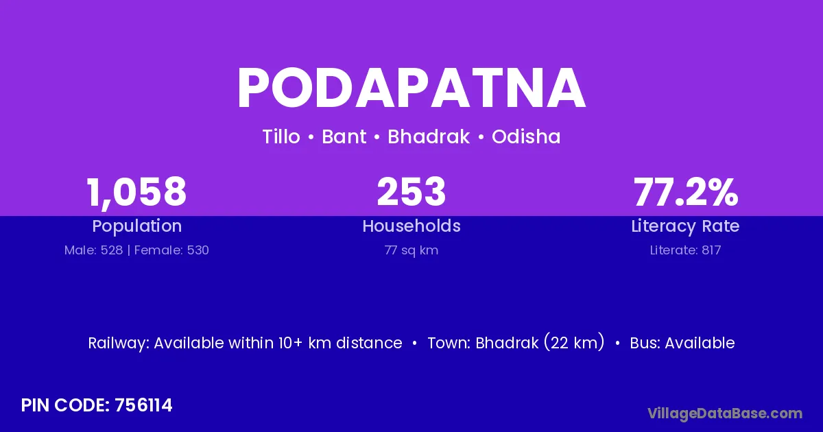 Bhadrak (22 km) is the nearest town to Podapatna village for major economic activities and is located approximately 22 km away.