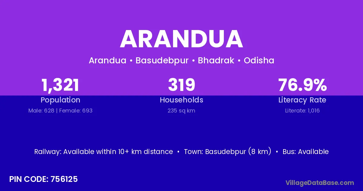 Basudebpur (8 km) is the nearest town to Arandua village for major economic activities and is located approximately 8 km away.