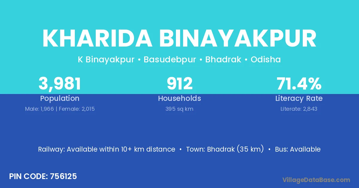 Bhadrak (35 km) is the nearest town to Kharida Binayakpur village for major economic activities and is located approximately 35 km away.