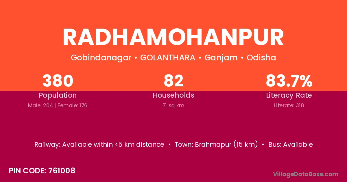 Basudebpur (15 km) is the nearest town to Radhamohanpur village for major economic activities and is located approximately 15 km away.