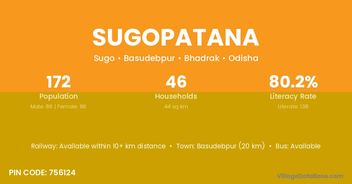 Basudebpur (20 km) is the nearest town to Sugopatana village for major economic activities and is located approximately 20 km away.