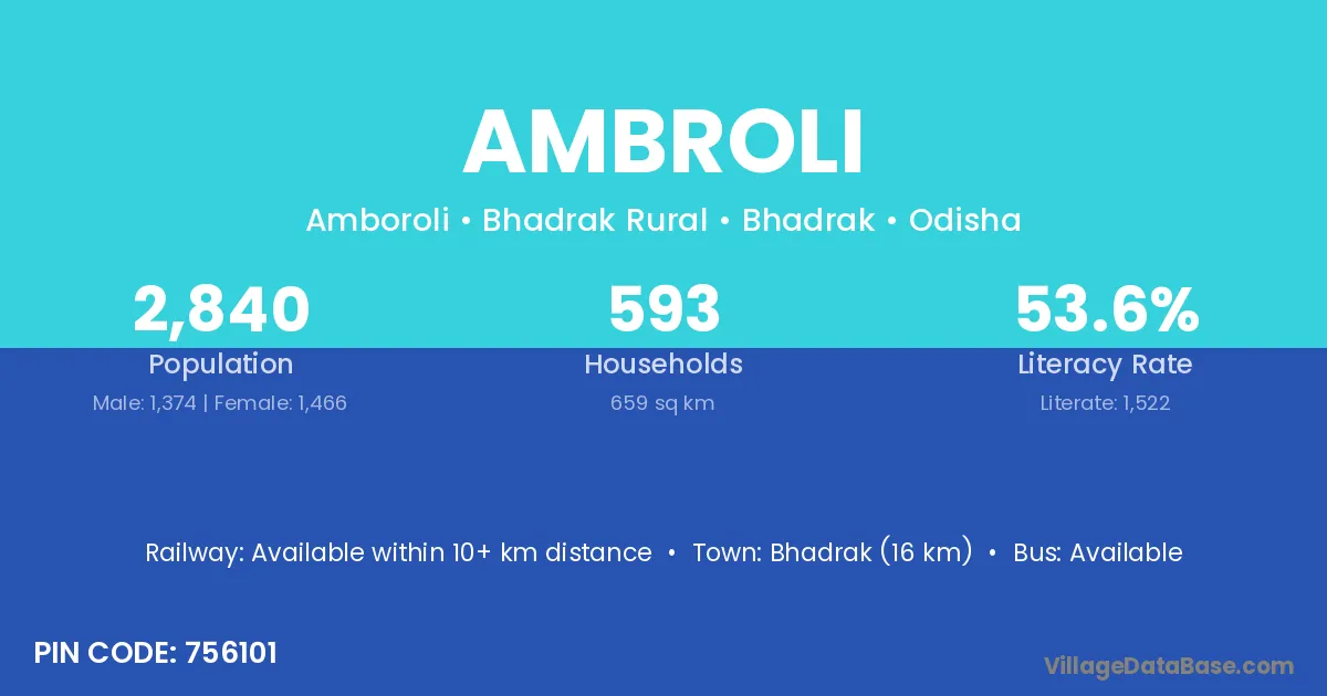 Bhadrak (16 km) is the nearest town to Ambroli village for major economic activities and is located approximately 16 km away.