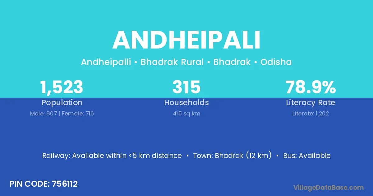 Bhadrak (12 km) is the nearest town to Andheipali village for major economic activities and is located approximately 12 km away.