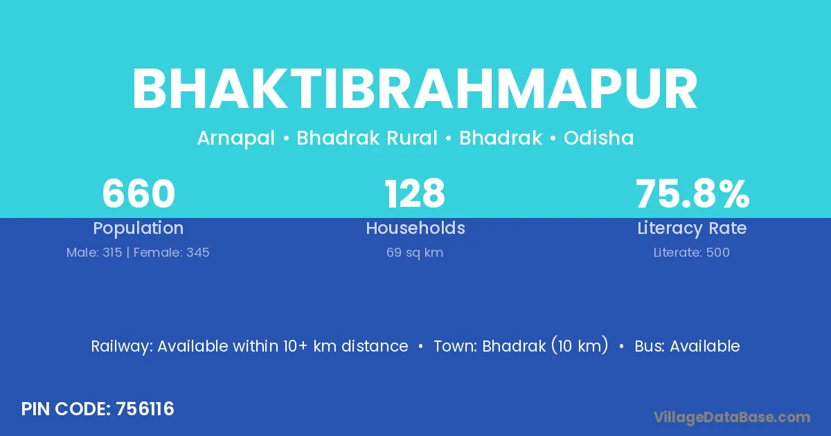 Bhaktibrahmapur village has a total population of 660 people, of which 315 are males and 345 are females.