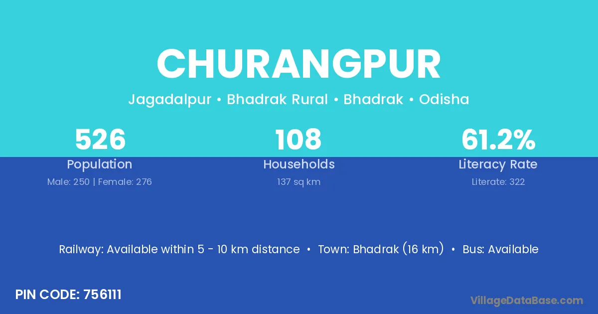 Bhadrak (16 km) is the nearest town to Churangpur village for major economic activities and is located approximately 16 km away.