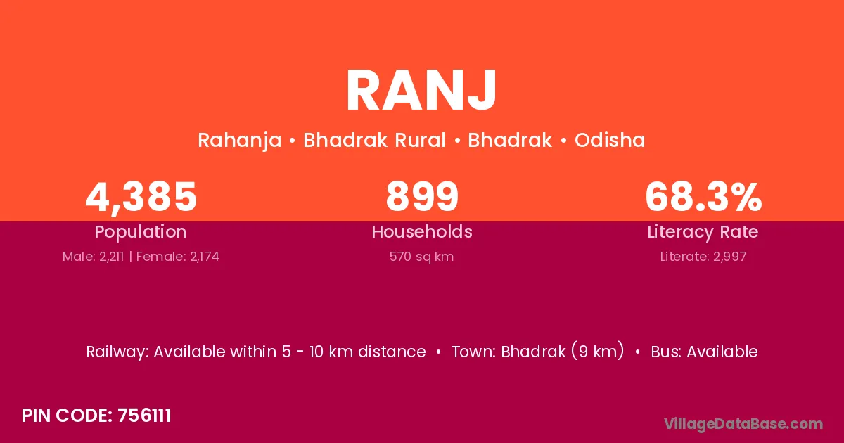 Bhadrak (9 km) is the nearest town to Ranj village for major economic activities and is located approximately 9 km away.