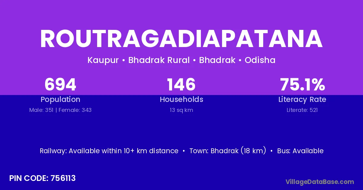 Bhadrak (18 km) is the nearest town to Routragadiapatana village for major economic activities and is located approximately 18 km away.