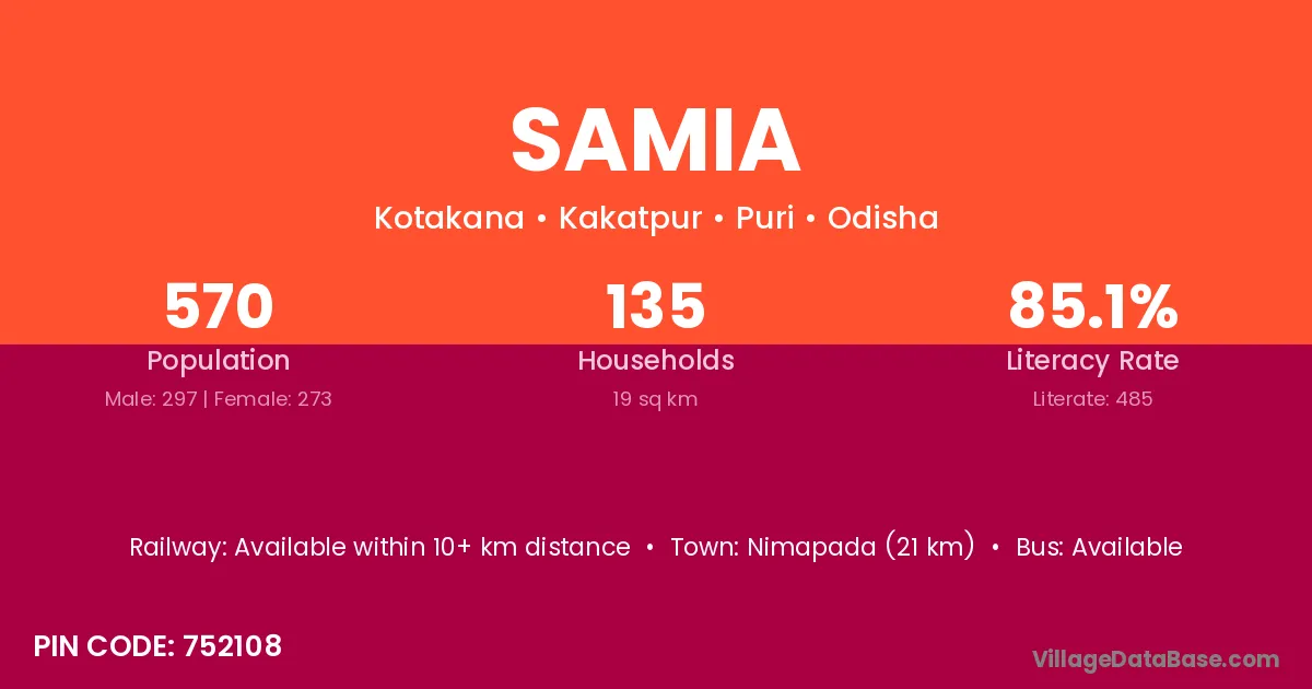Bhadrak (20 km) is the nearest town to Samia village for major economic activities and is located approximately 20 km away.