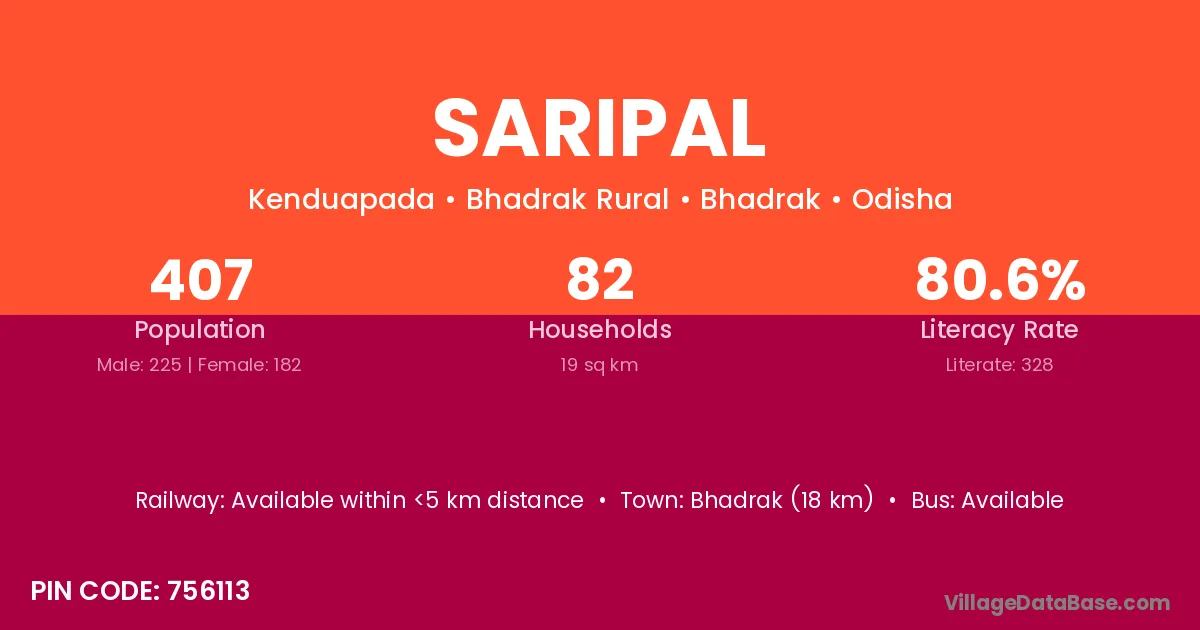 Bhadrak (18 km) is the nearest town to Saripal village for major economic activities and is located approximately 18 km away.