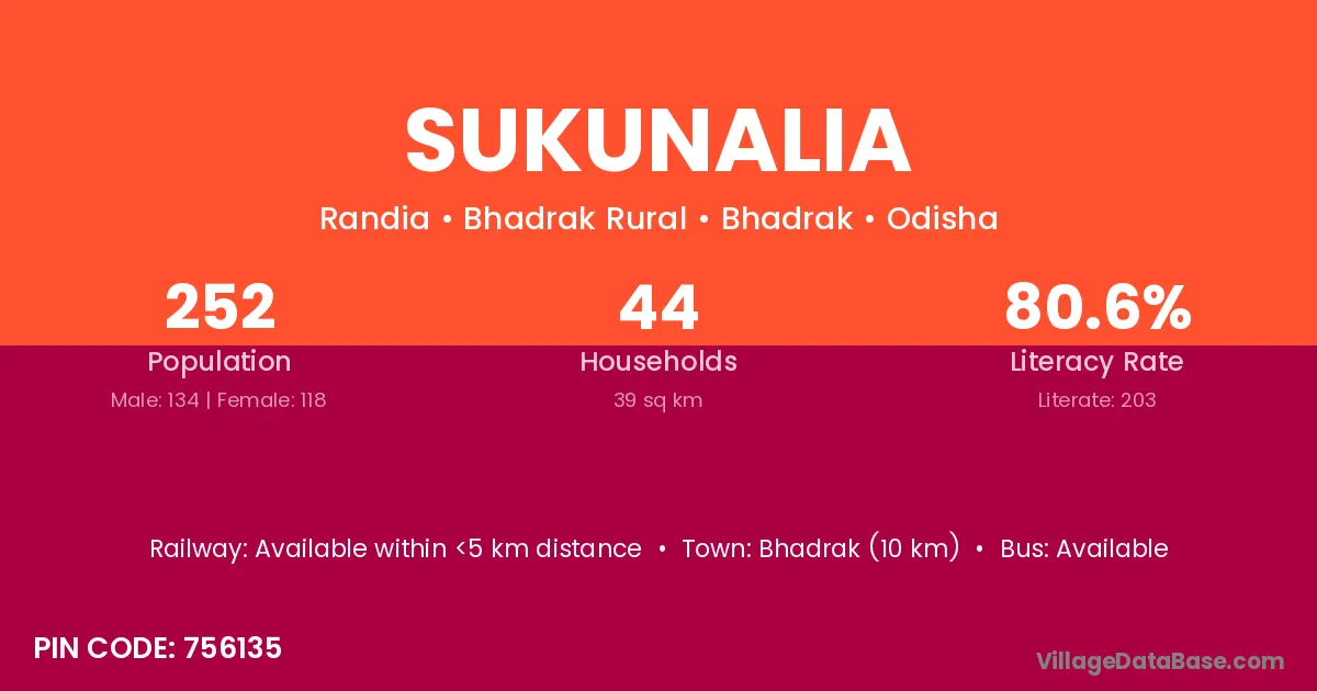 Bhadrak (10 km) is the nearest town to Sukunalia village for major economic activities and is located approximately 10 km away.