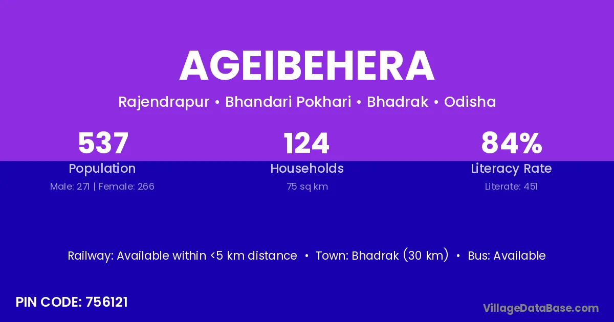 Bhadrak (30 km) is the nearest town to Ageibehera village for major economic activities and is located approximately 30 km away.