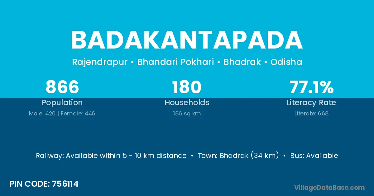 Bhadrak (34 km) is the nearest town to Badakantapada village for major economic activities and is located approximately 34 km away.
