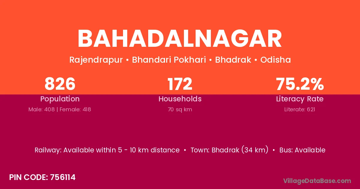 Bhadrak (34 km) is the nearest town to Bahadalnagar village for major economic activities and is located approximately 34 km away.