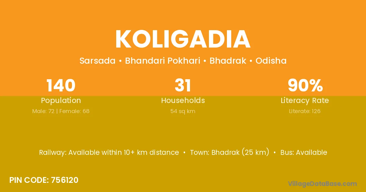 Bhadrak (25 km) is the nearest town to Koligadia village for major economic activities and is located approximately 25 km away.