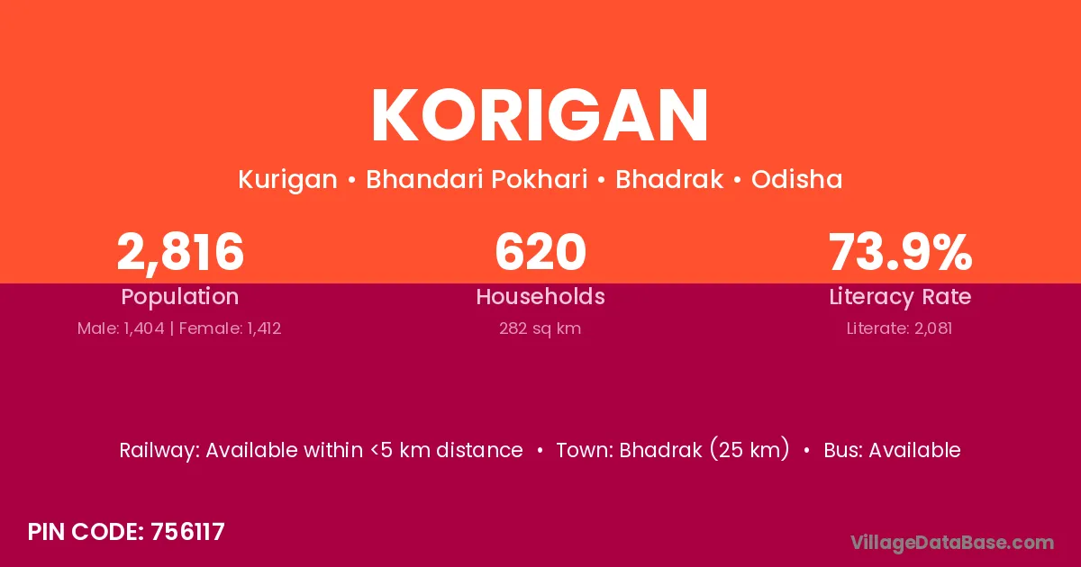 Bhadrak (25 km) is the nearest town to Korigan village for major economic activities and is located approximately 25 km away.