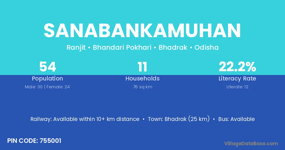 Bhadrak (25 km) is the nearest town to Sanabankamuhan village for major economic activities and is located approximately 25 km away.