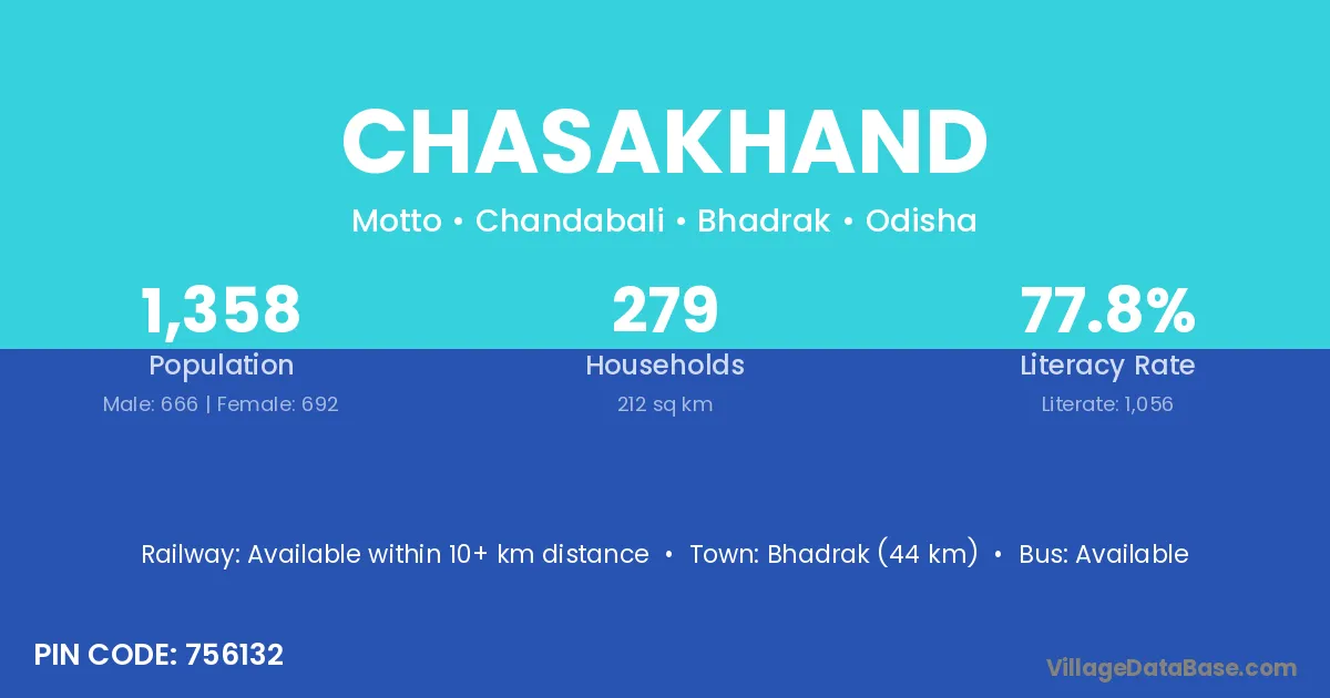 Bhadrak (44 km) is the nearest town to Chasakhand village for major economic activities and is located approximately 44 km away.