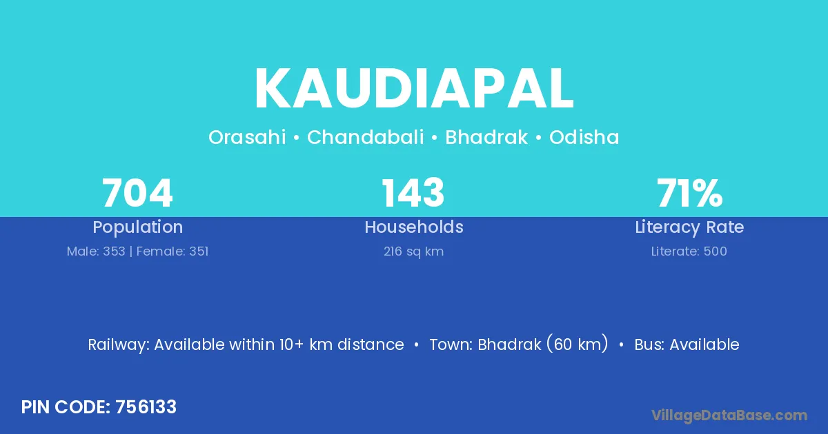 Bhadrak (60 km) is the nearest town to Kaudiapal village for major economic activities and is located approximately 60 km away.