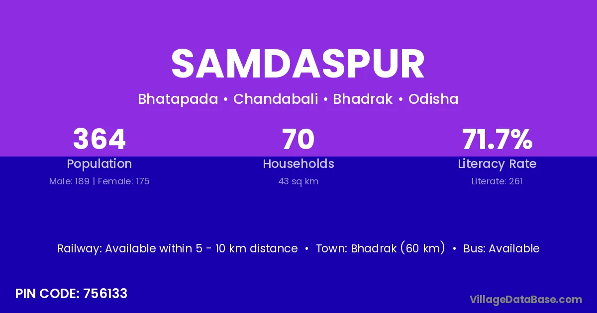 Bhadrak (60 km) is the nearest town to Samdaspur village for major economic activities and is located approximately 60 km away.