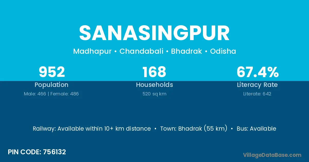 Bhadrak (55 km) is the nearest town to Sanasingpur village for major economic activities and is located approximately 55 km away.