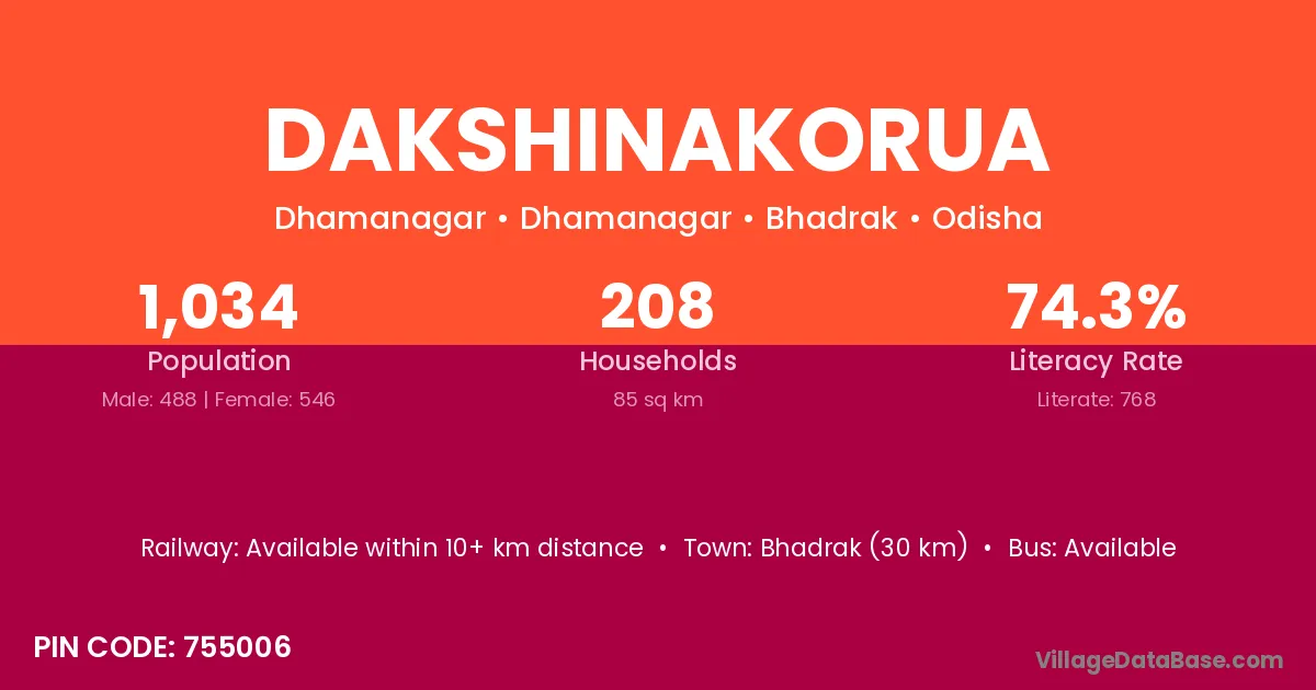 Bhadrak (30 km) is the nearest town to Dakshinakorua village for major economic activities and is located approximately 30 km away.