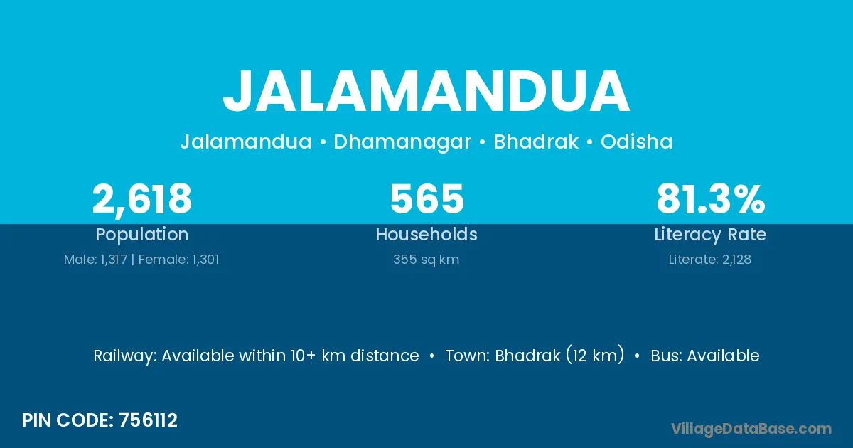 Bhadrak (12 km) is the nearest town to Jalamandua village for major economic activities and is located approximately 12 km away.