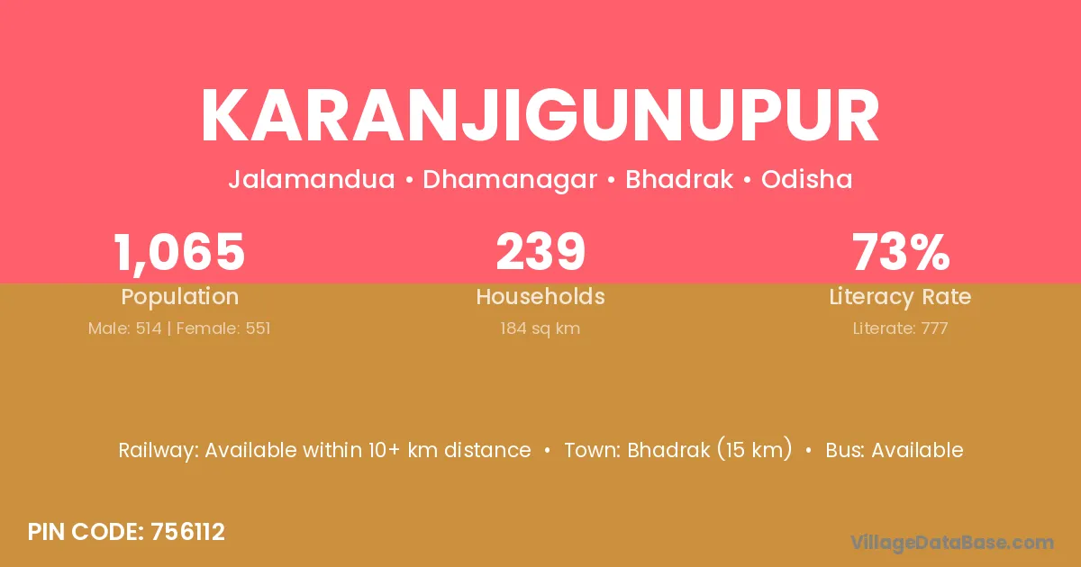 Bhadrak (15 km) is the nearest town to Karanjigunupur village for major economic activities and is located approximately 15 km away.
