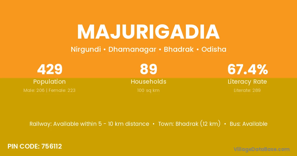Bhadrak (12 km) is the nearest town to Majurigadia village for major economic activities and is located approximately 12 km away.