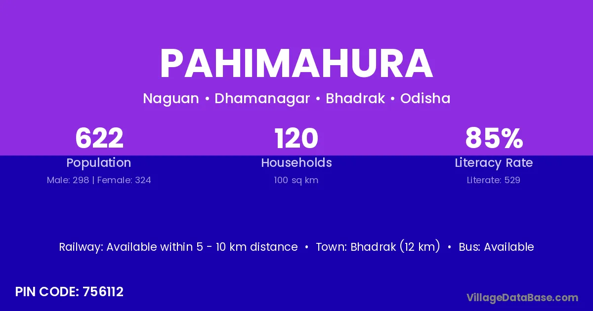 Bhadrak (12 km) is the nearest town to Pahimahura village for major economic activities and is located approximately 12 km away.